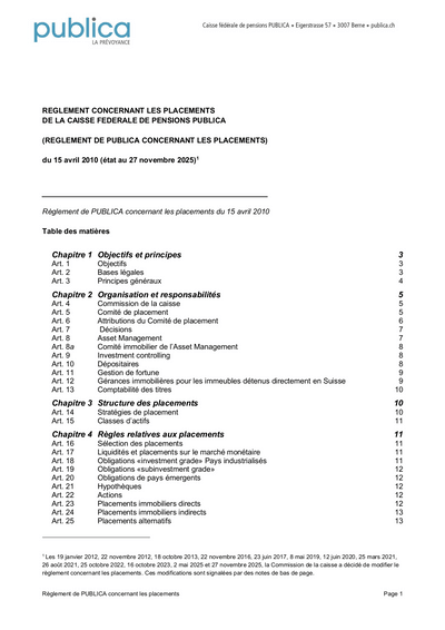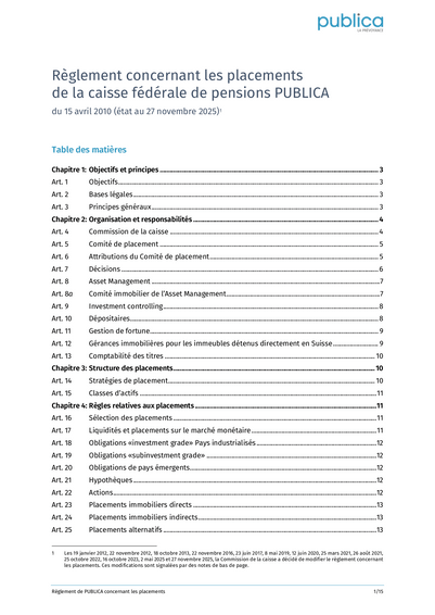 Le règlement concernant les placements donne au personnel du service Asset Management de PUBLICA des directives concrètes pour le placement de la fortune de prévoyance:
