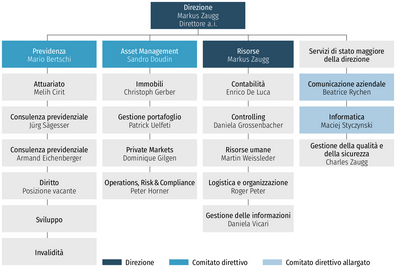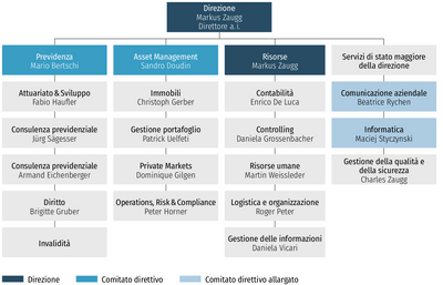 Il nostro Comitato direttivo è composto da cinque persone, di cui due fanno parte del Comitato direttivo allargato. I membri del Comitato direttivo sono i responsabili dei settori Previdenza, Asset Management, Risorse nonché i Servizi di stato maggiore, di cui fanno parte la Comunicazione aziendale e l’Informatica.